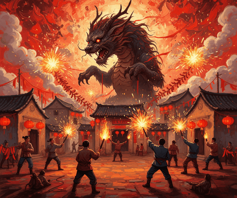 There is an ancient legend about a monster named Nian who appeared at the beginning of each year, bringing fear and destruction. The villagers discovered Nian was afraid of loud noises, bright lights… and the color red.