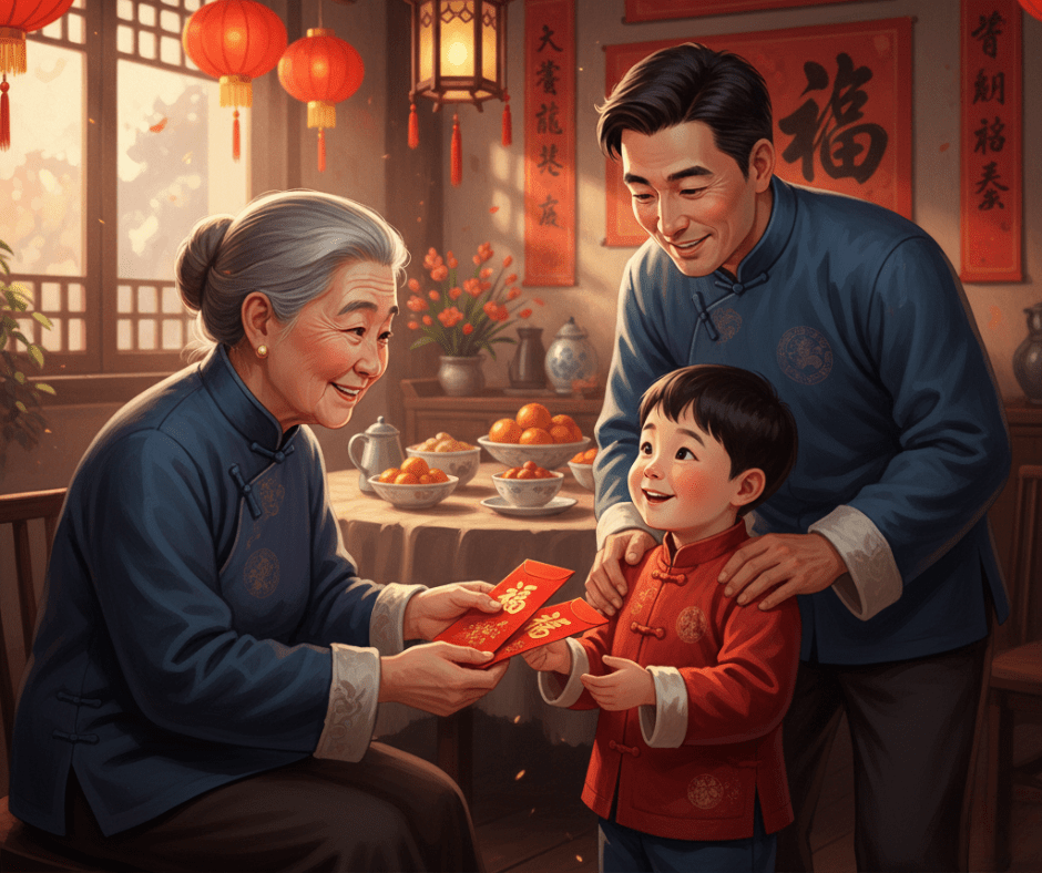 During Lunar New Year, elders give children red envelopes — hongbao — filled with money.